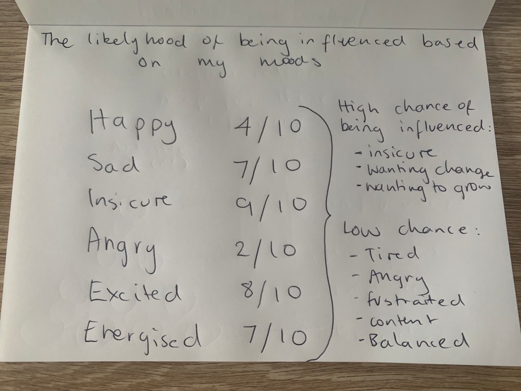 I decided that in order to get a raw and true understanding of how I am impacted by these influencers, I would record myself for 5 days straight, just after interacting with the content of the three influencers I am studying.